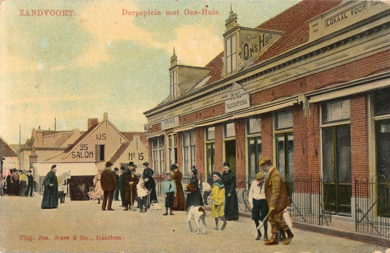 Een kleine ruimte midden in het oude dorp, omzoomd door lage woningen, waaronder de hoefsmederij van Versteege, die daar al sinds 1862 is gevestigd. Zo ongeveer moet men zich het Dorpsplein voorstellen in de tijd dat ds. Hulsman, predikant in Zandvoort van 1894-1903, zich inspande om te komen tot het stichten van wat hij noemde, een ‘vergaderlokaal voor de jeugd, waar geen drank werd geschonken’. In de beginjaren van zijn predikantschap in Zandvoort had hij de Zandvoortse bevolking leren kennen en ook hun drankproblemen. Hij was zeer begaan met de jongens die soms al vanaf hun tiende jaar met de vaders naar zee gingen – een leerplichtwet was er toentertijd nog niet – en zo al vroeg sterke drank leerden gebruiken. Hij kreeg kapitaalkrachtige dorpsbewoners enthousiast voor zijn plan en dankzij een aanzienlijke gift van de toen bekende filantroop P.W. Jansen, kon in 1897 aan het Dorpsplein de benodigde grond worden gekocht en in 1898 Ons Huis, Volkskoffiehuis, Lokaal voor Christelijke en Maatschappelijke Belangen worden geopend. Mede door het drukke gebruik van de twee zalen die het gebouw telde, bleek al kort na de opening behoefte aan meer ruimte. Daarvoor werd een belendend perceel, een oud logement, aangekocht en aan Ons Huis toegevoegd. In 1935 is het oude Ons Huis geheel afgebroken en volledig, zij het moderner, herbouwd. Het gebouw is in de jaren 1950 door de hervormde gemeente verkocht en heeft in de loop van de daaropvolgende jaren diverse functies gehad, onder andere die van veilinghuis en horecagelegenheid.