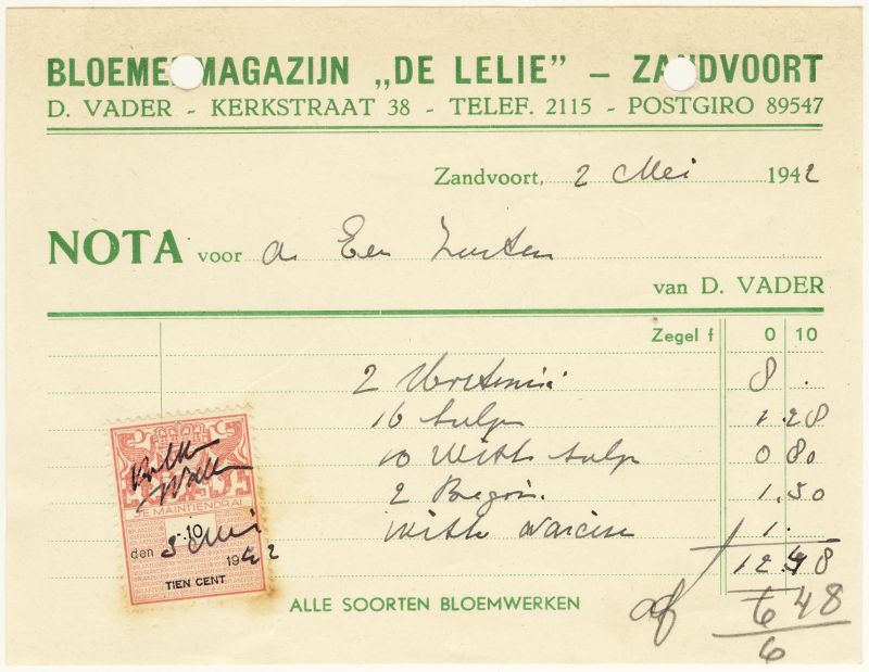 Bloemenmagazijn -De Lelie-, D. Vader, Kerkstraat 38, 1942