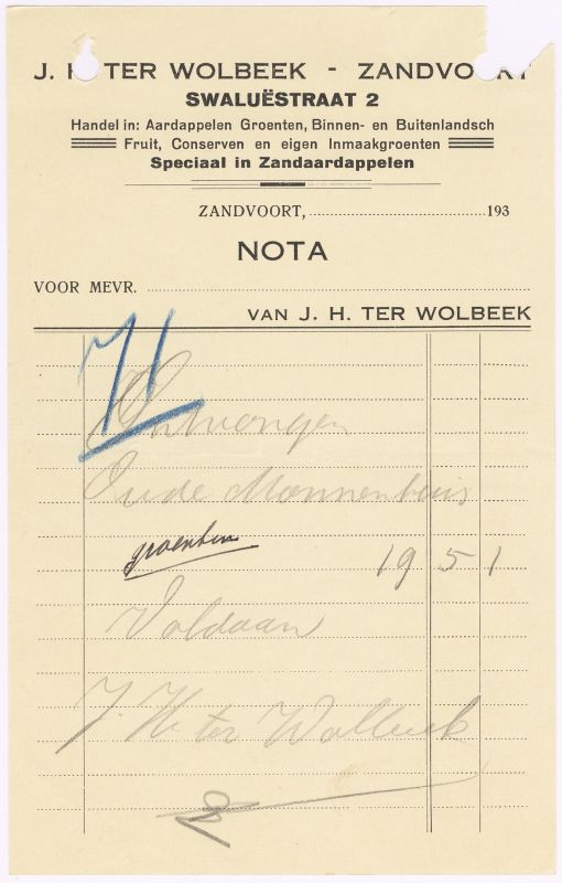J.H. Ter Wolbeek, Aardappelen En Groenten, SwaluëStraat 2, 1951