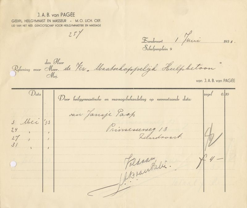 J.A.B. Van Pagee, Gedipl. Heilgymnast En Masseur, Schelpenplein 9, 1933