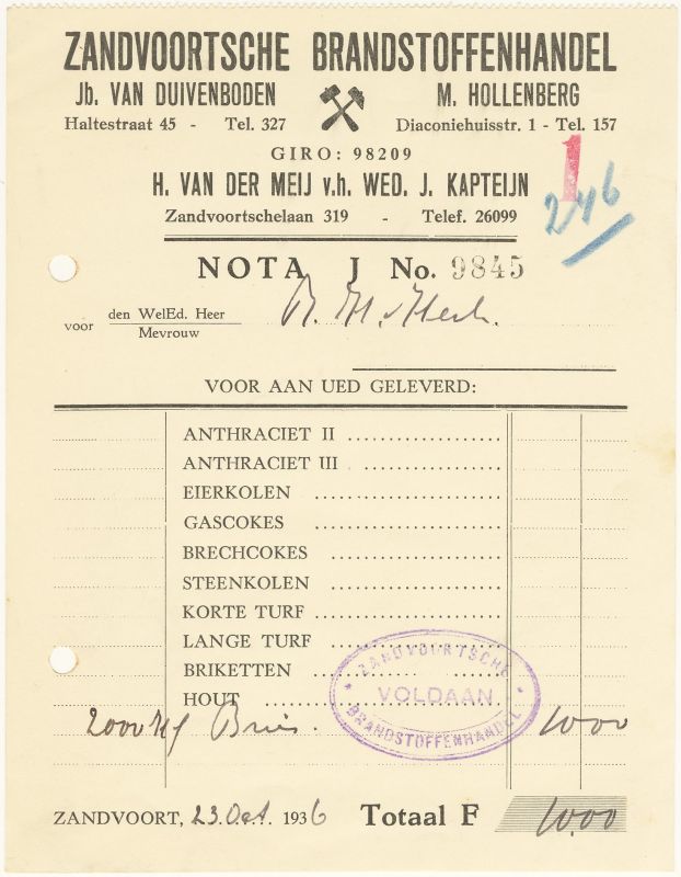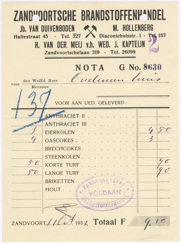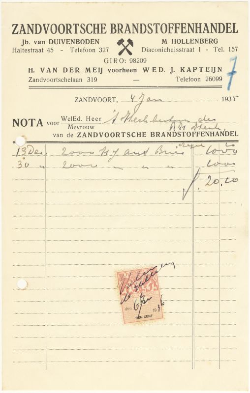 Zandvoortse Brandstoffenhandel, Jb. Van Duivenboden En M. Hollenberg, 1932