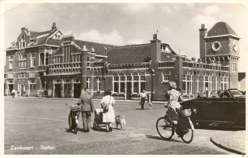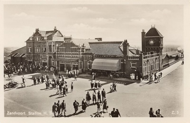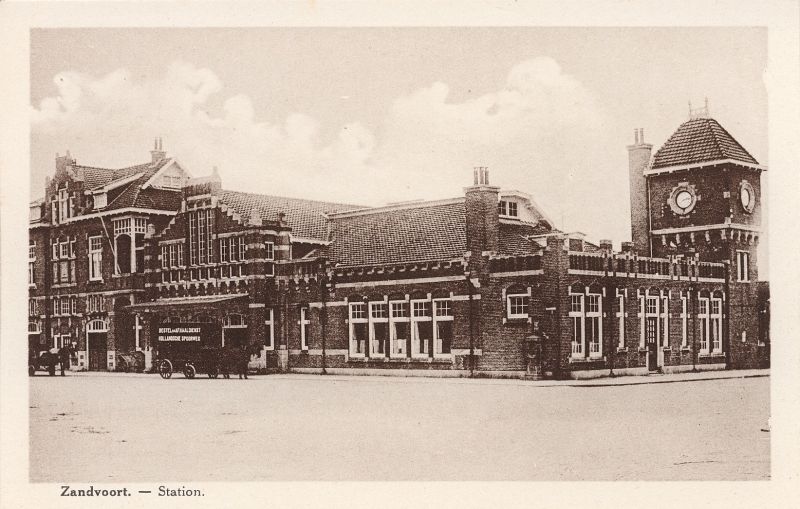 De bouw geschiedde onder leiding van de toenmalige H.IJ.S.M-ingenieur L.C. Westhoff, die ook de leiding heeft gehad bij de bouw van het Haarlemse Station. Met het front naar zee gekeerd maakt het ruim 70 meter lange en 14 meter brede hoofdgebouw een markante indruk. De gevel waarvan de bouw niet tot een bepaalde stijl is terug te voeren, is opgetrokken uit baksteen en wordt gedekt door verglaasde rode pannen waardoor het geheel met zijn imposante hoektoren met klokken toch een bepaalde allure heeft. Drie dubbele deuren geven toegang tot de hal. In de gevel daarboven zijn negen vensterruiten van gebrand glas aangebracht, waarvan er acht met wapens van provincies zijn versierd. Het middelste laat het wapen van Zandvoort zien. Dit laatste motief is ook in verglaasde baksteen uitgevoerd boven de ingang van de voormalige dienstwoning. Boven diezelfde ingang zijn eveneens in verglaasde baksteen het wapen van Holland en een locomotieffiguur verwerkt. In de hal van het station ziet men vier gebeeldhouwde koppen, die de met visserschepen en andere figuren kleurig beschilderde kap schragen. Deze koppen, gebeeldhouwd door C. Veldheer te Haarlem, stellen badgasten voor (heer en dame) en een vissersman en een vissersvrouw.